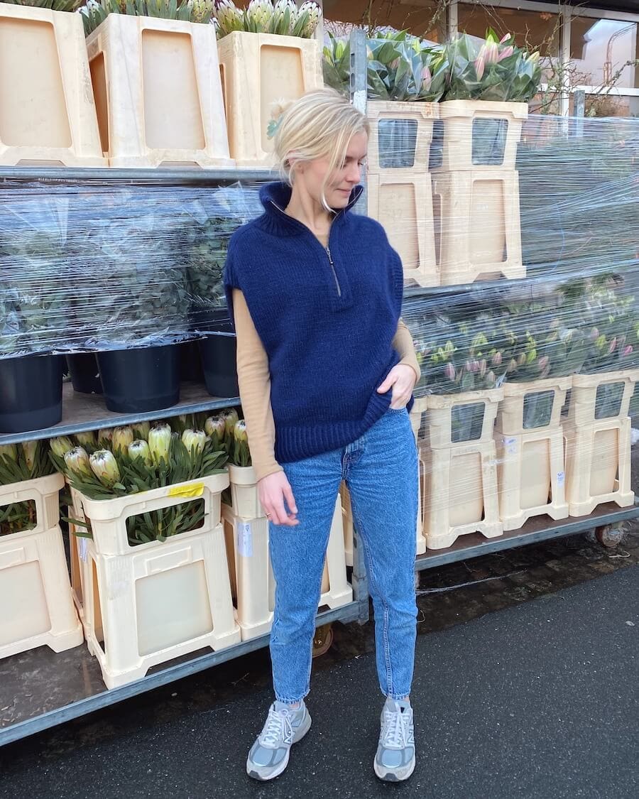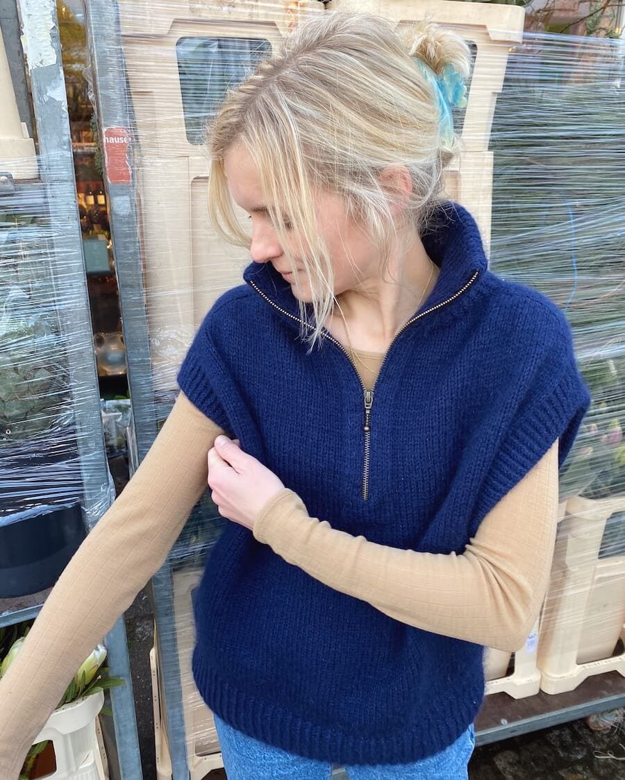 Zipper Slipoveren på billedet er strikket i Peruvian Highland Wool i farven Navy Blue fra Filcolana og Tilia fra Filcolana i farven Navy Blue.