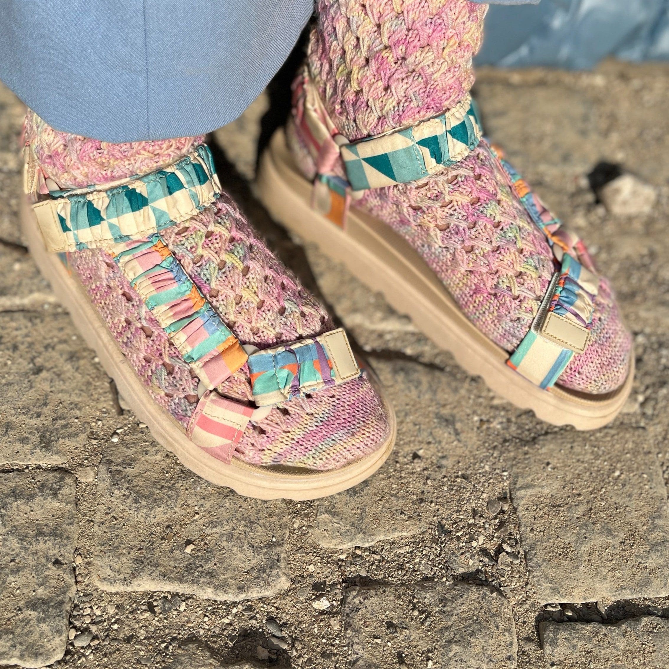 Euphoria Socks er strikket i glatstrik på hæl, tå og underside, og med det fine vævestriksmønster på oversiden af foden og på skaftet, som afsluttes med en lille ribkant. Strømperne strikkes nedefra og op.