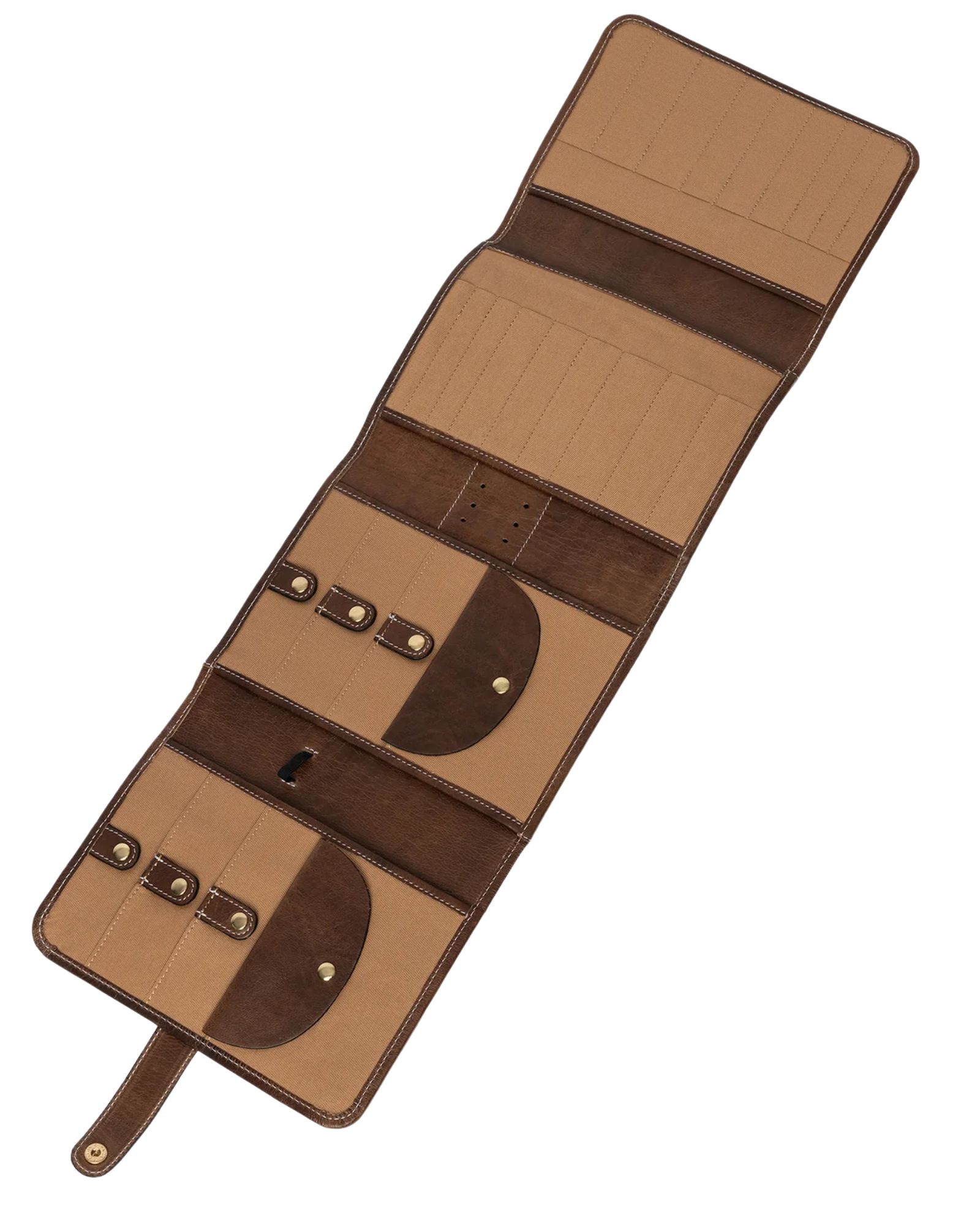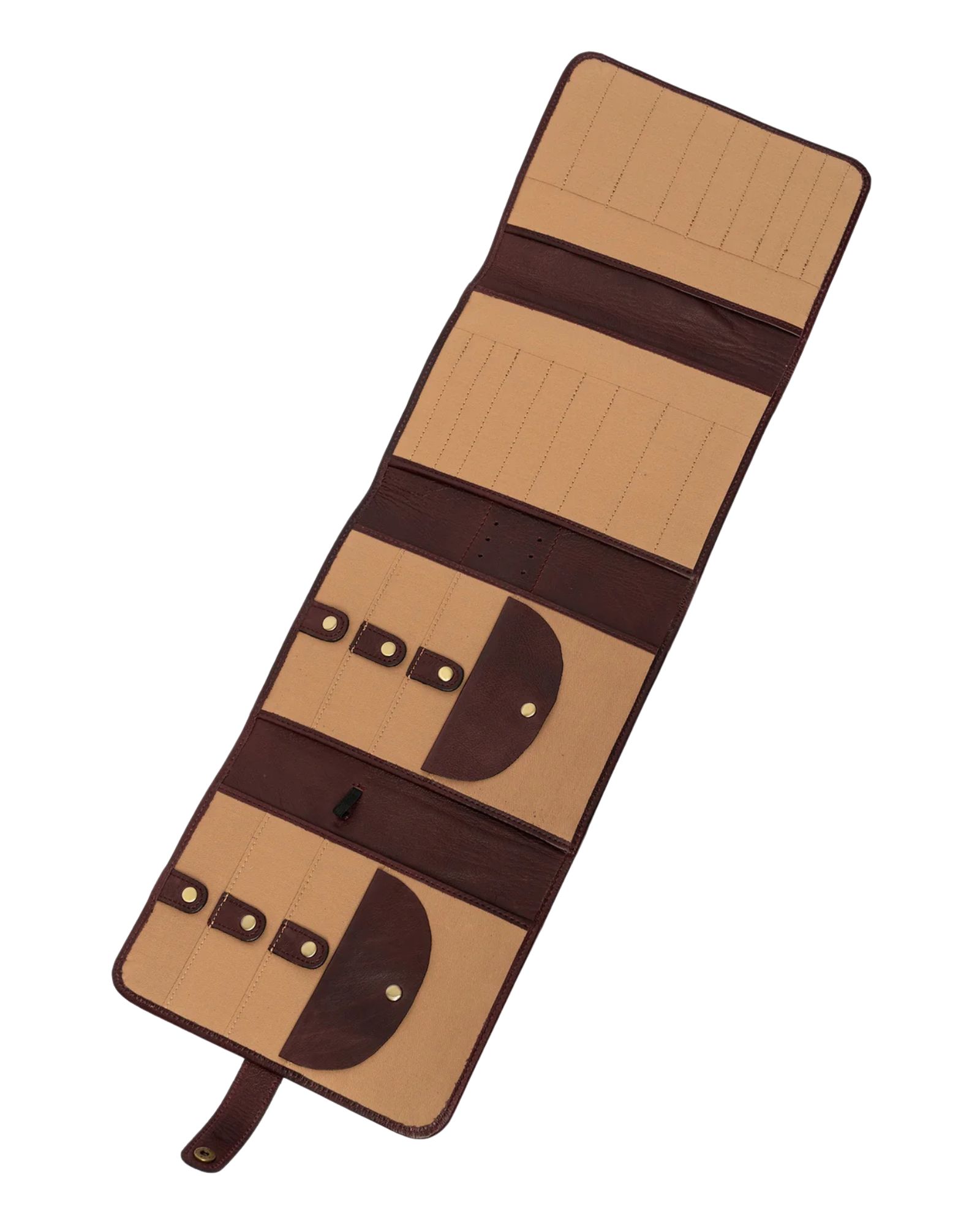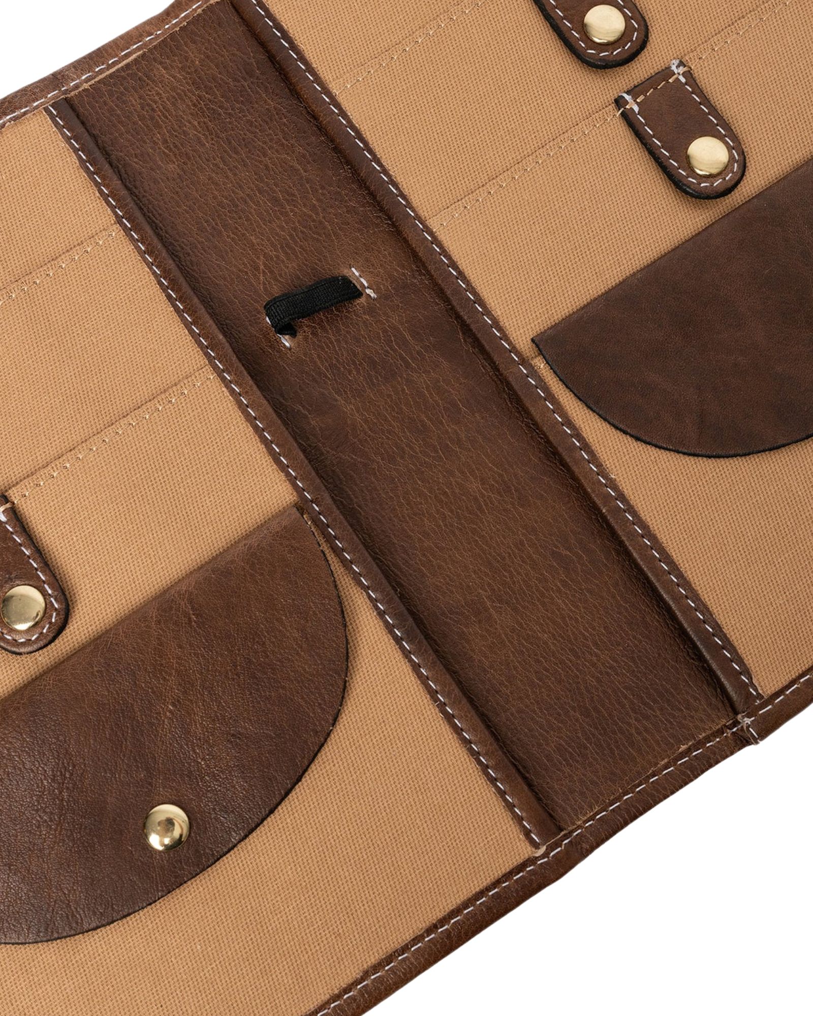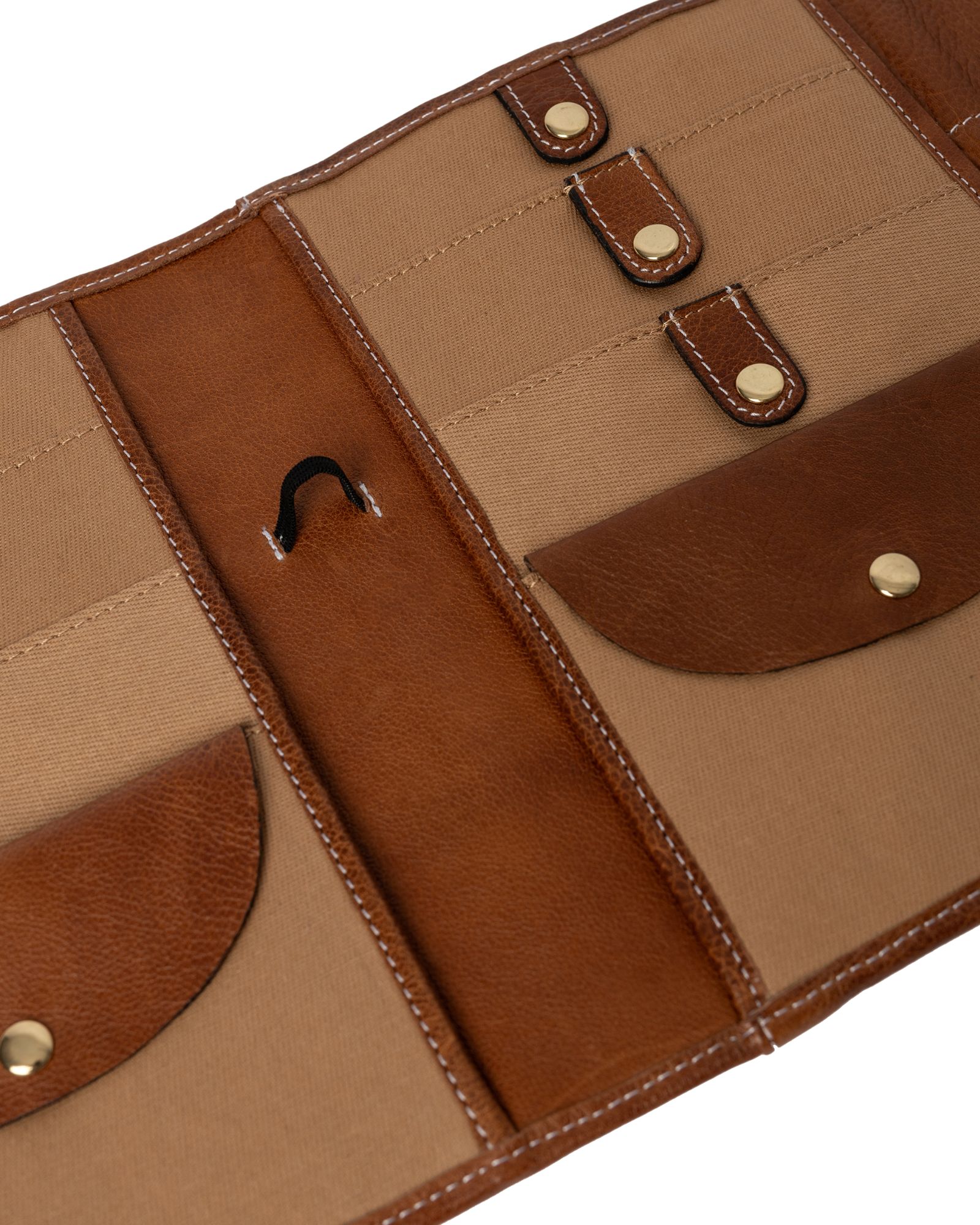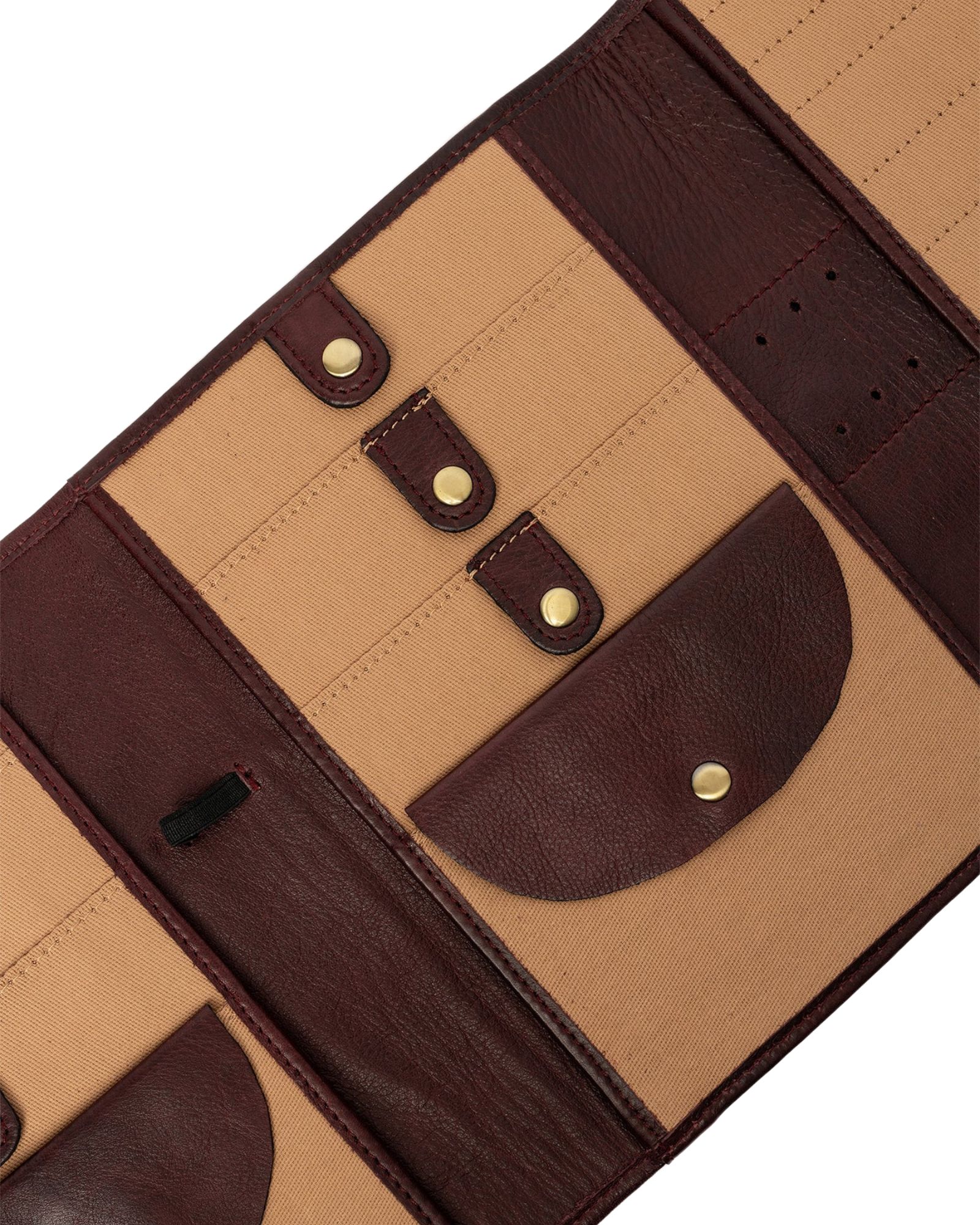 Der er 6 lommer med trykknap til at fastholde dine wirer. Bag disse lommer er der åbne lommer, hvor man kan opbevare strikkeopskrift eller lignende. En elastik gør det muligt at placere målebåndet, og 6 huller i læderet giver plads til 3 nåle. Hele 18 rum til dine pindespidser, hæklenåle eller strømpepinde sørger for, at alt er organiseret.