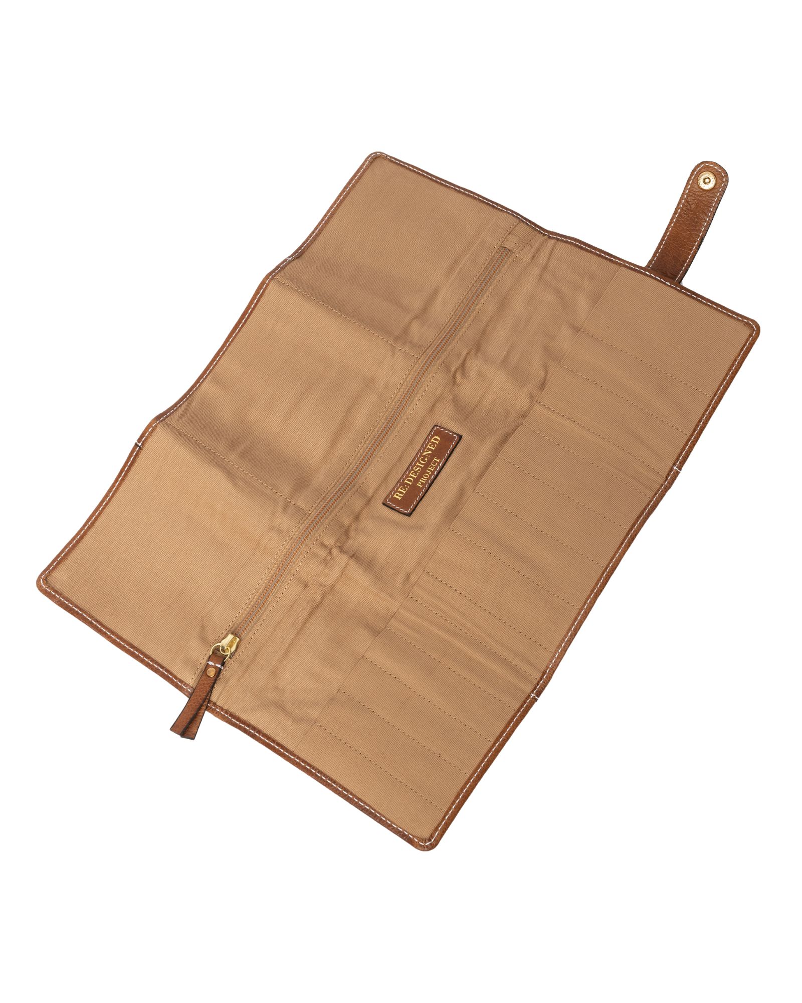 Hele etuiet foldes nemt sammen og lukkes af en trykknap, så den optager så lidt plads i din taske som muligt.