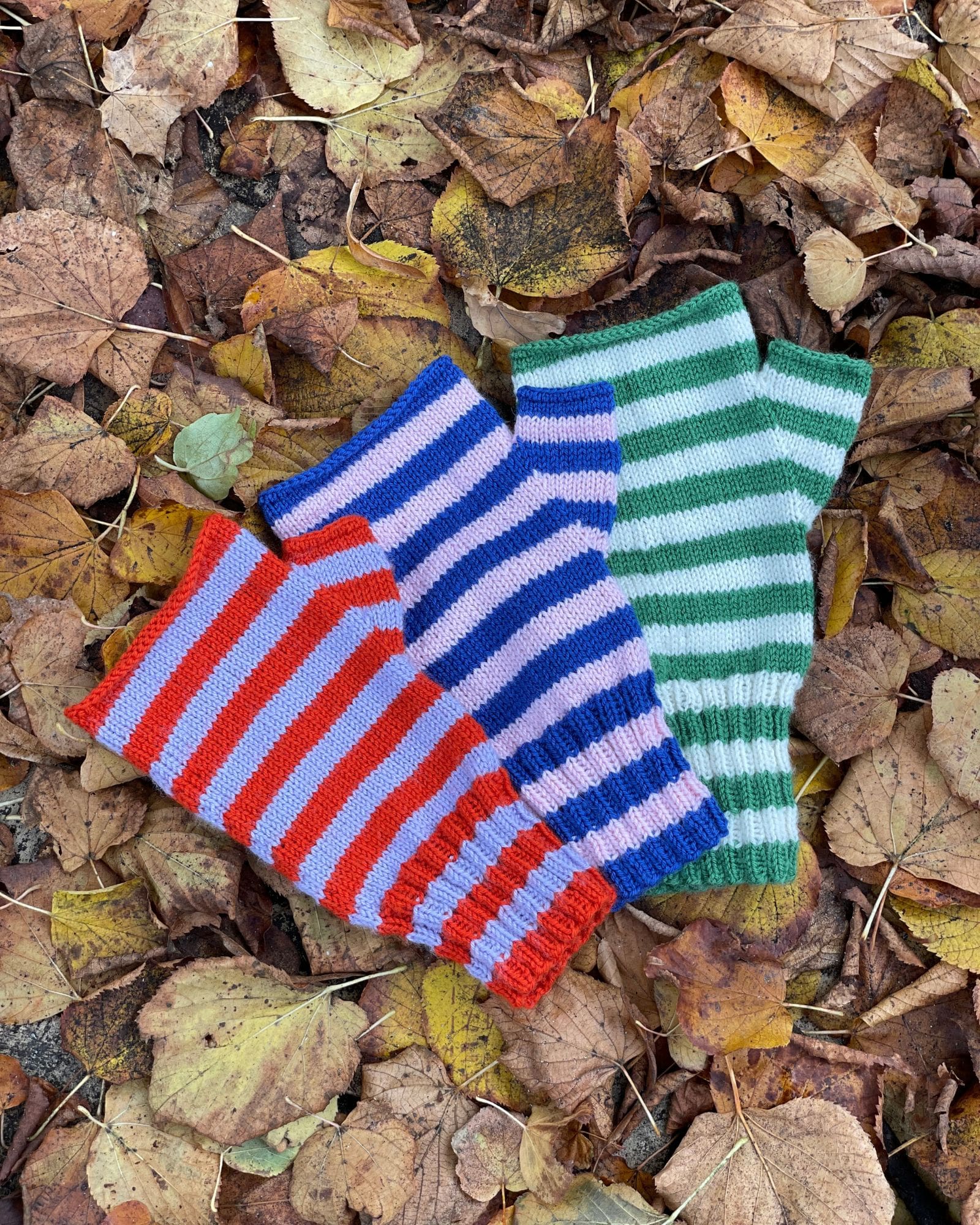 Sailor Gloves er perfekt, hvis du har behov for at have fingrene fri, men stadig ønsker lune og varme omkring håndflader og -led. Der bliver skruet ned for temperaturen, og derfor har flere af pigerne fra Tante Grøn erfaret, at en halvhandske er særligt genial, hvis man bruger mange timer på at arbejde foran computeren. Vi har strikket vores Sailor Gloves op i nogle dejlige og friske farver i vores bløde Bøllefrø-garn. Handsken strikkes fra skaftet og ud mod fingrene, hvor der tages ud til tommel undervejs.