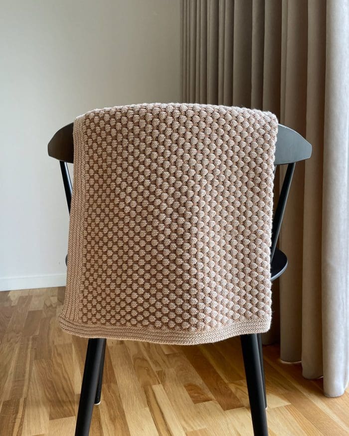 Det beige Sea Baby Blanket er strikket i Bøllefrø farve 48 Café Latte som bundfarve og farve 42 Camel som kontrastfarve.