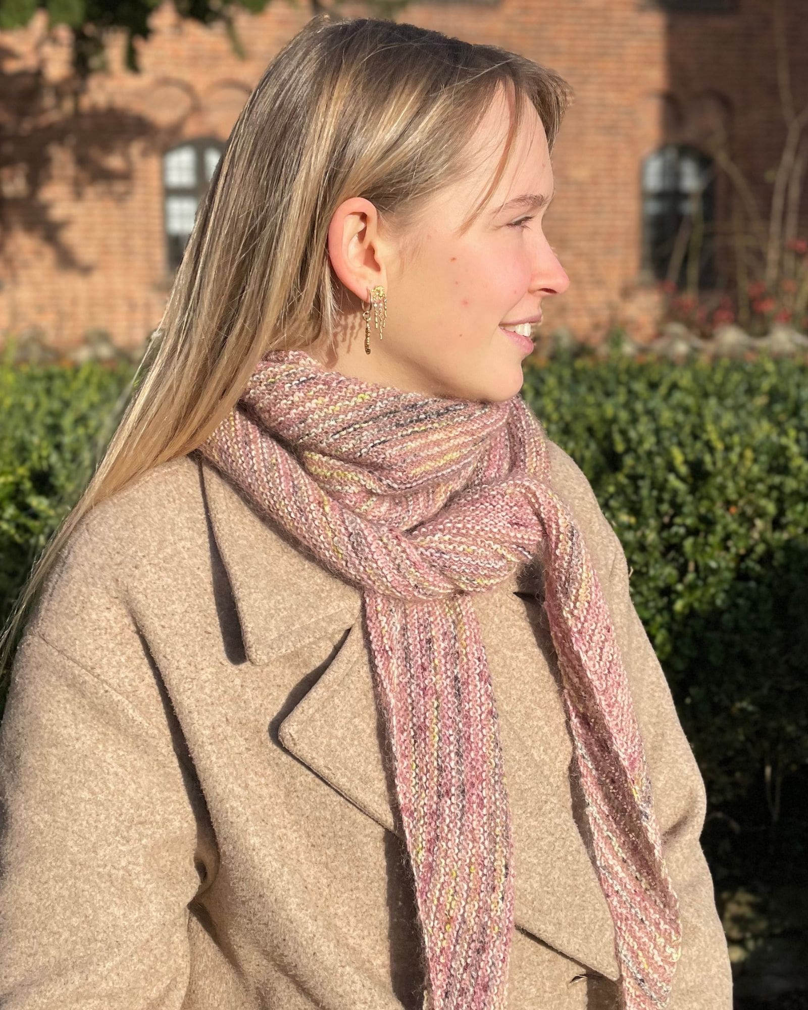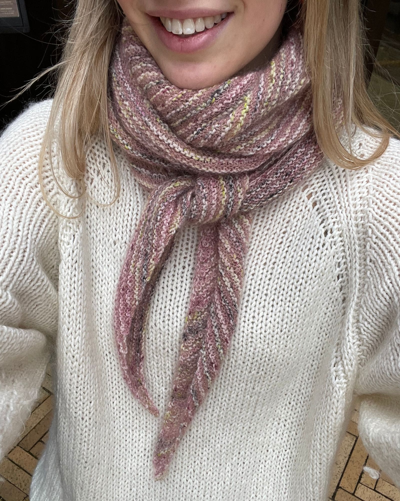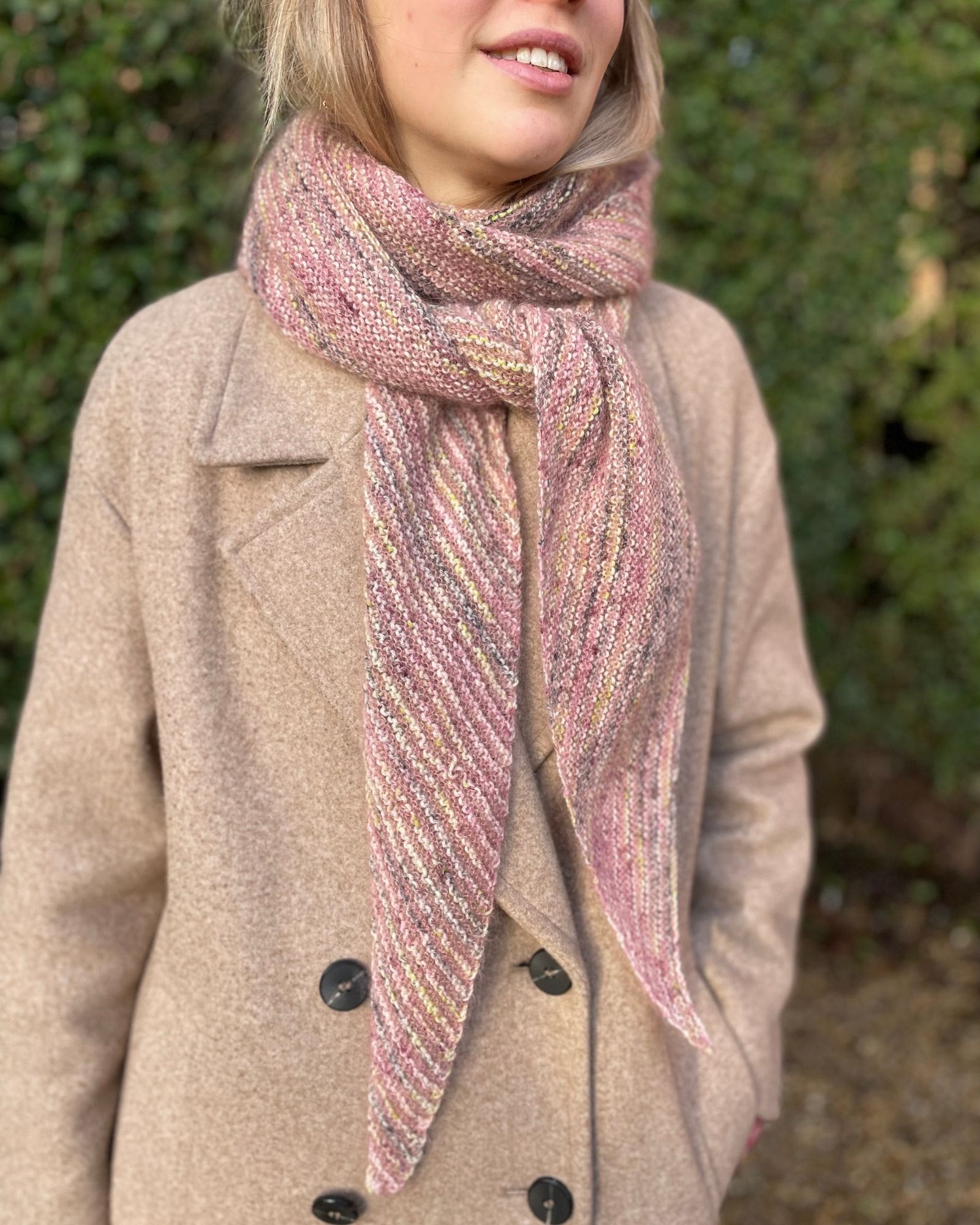Tørklædet / sjalet er strikket i Birk farve 104 Flower og Tilia farve 373 Vintage Rose.