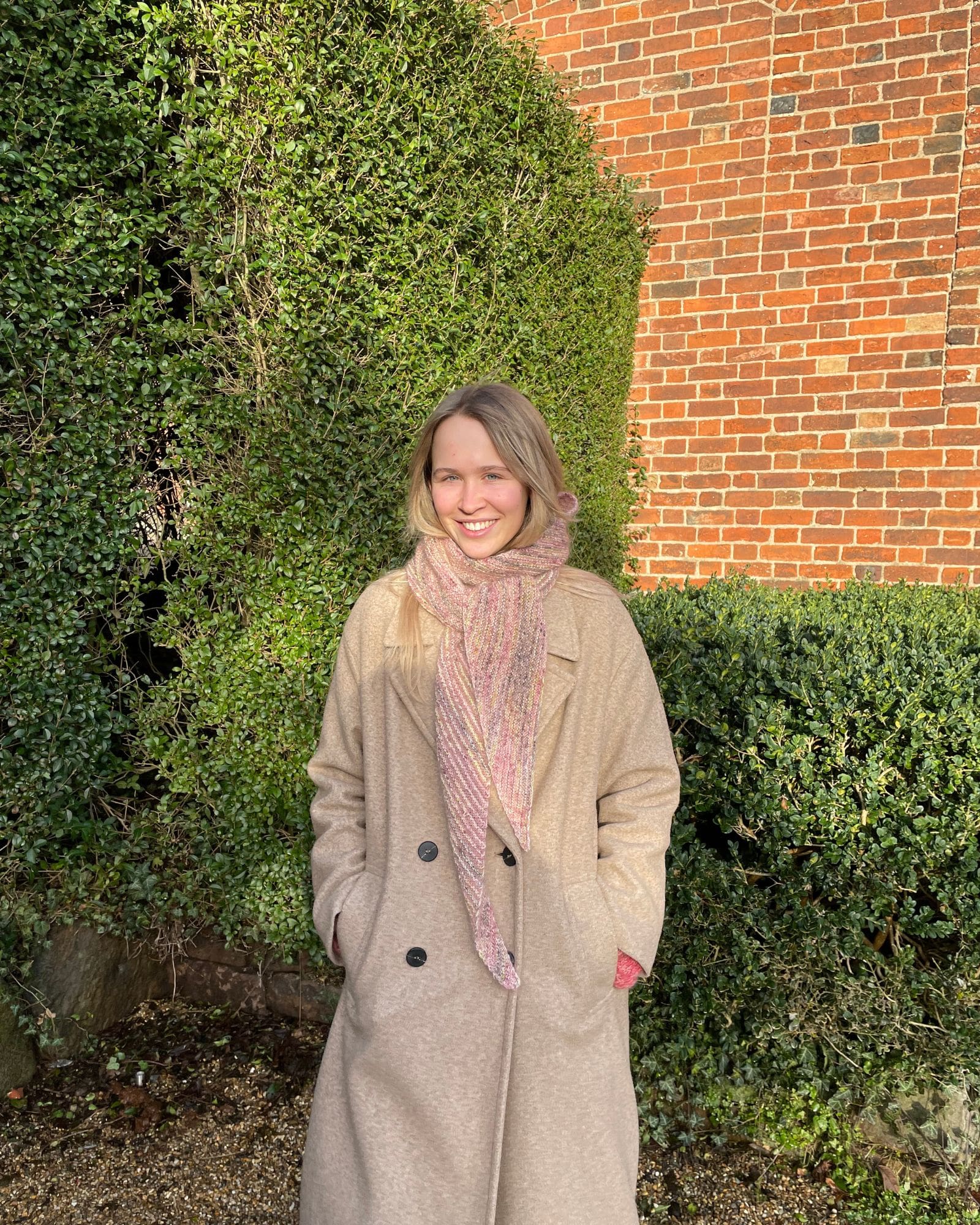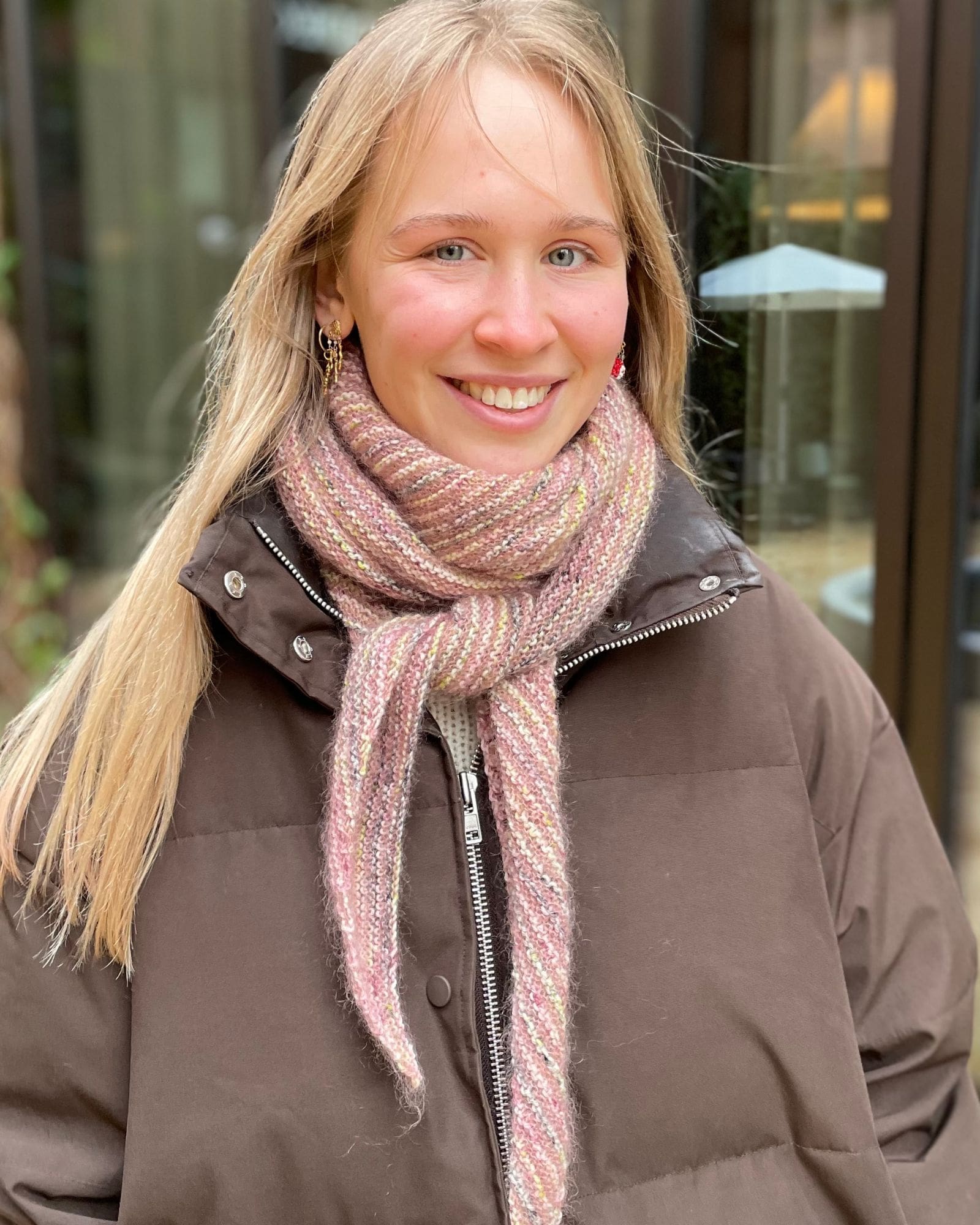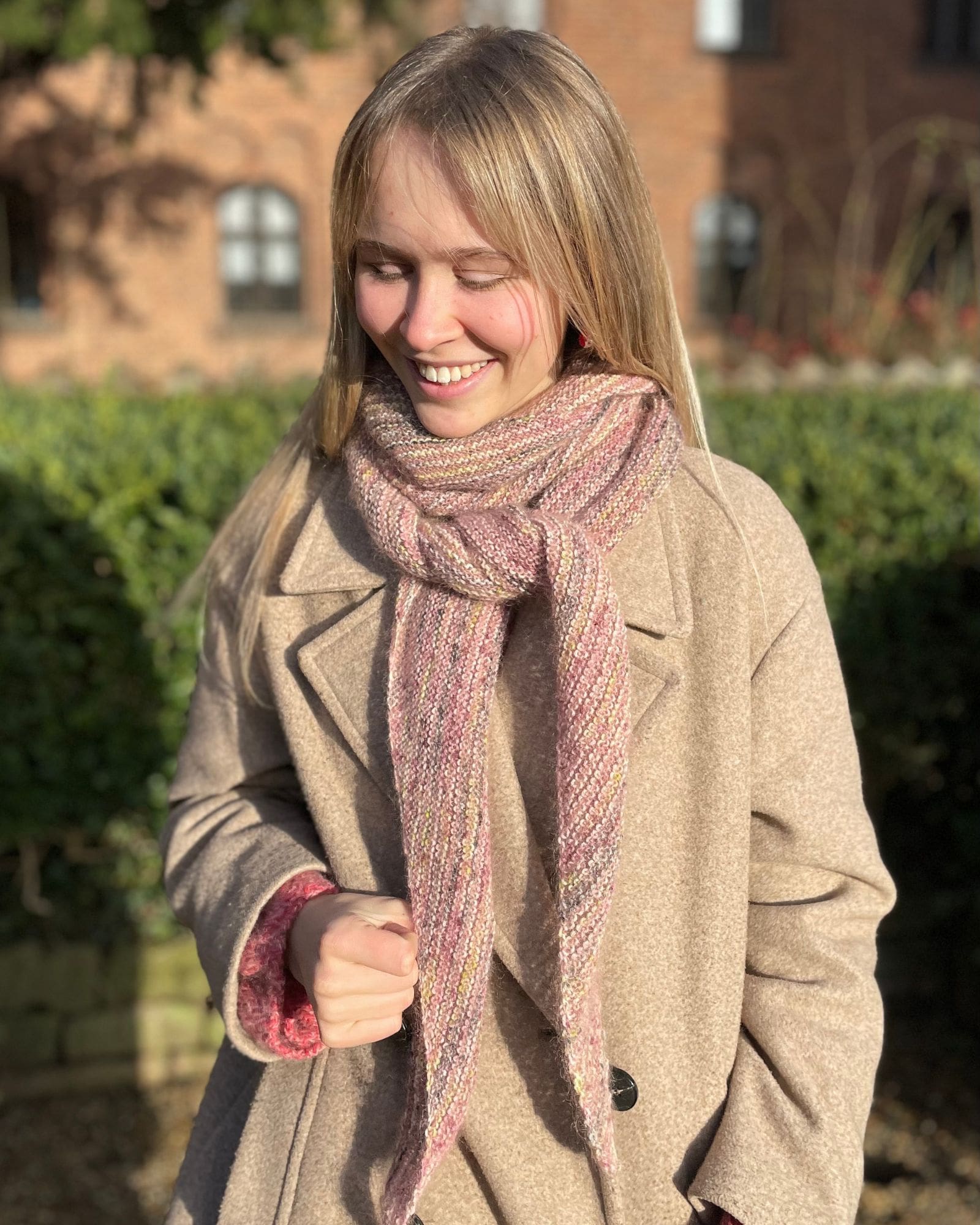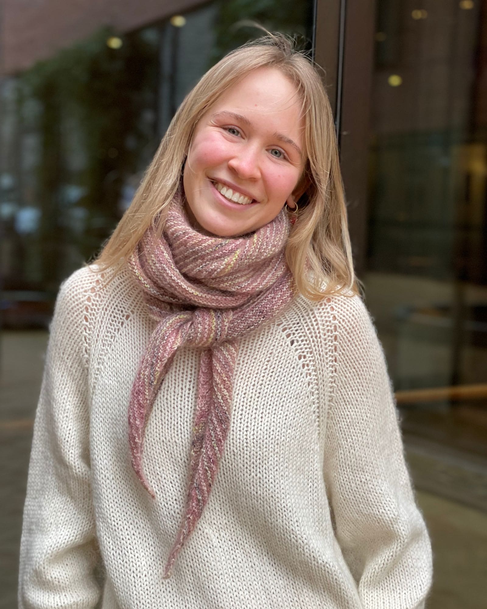 Tørklædet / sjalet er strikket i Birk farve 104 Flower og Tilia farve 373 Vintage Rose.
