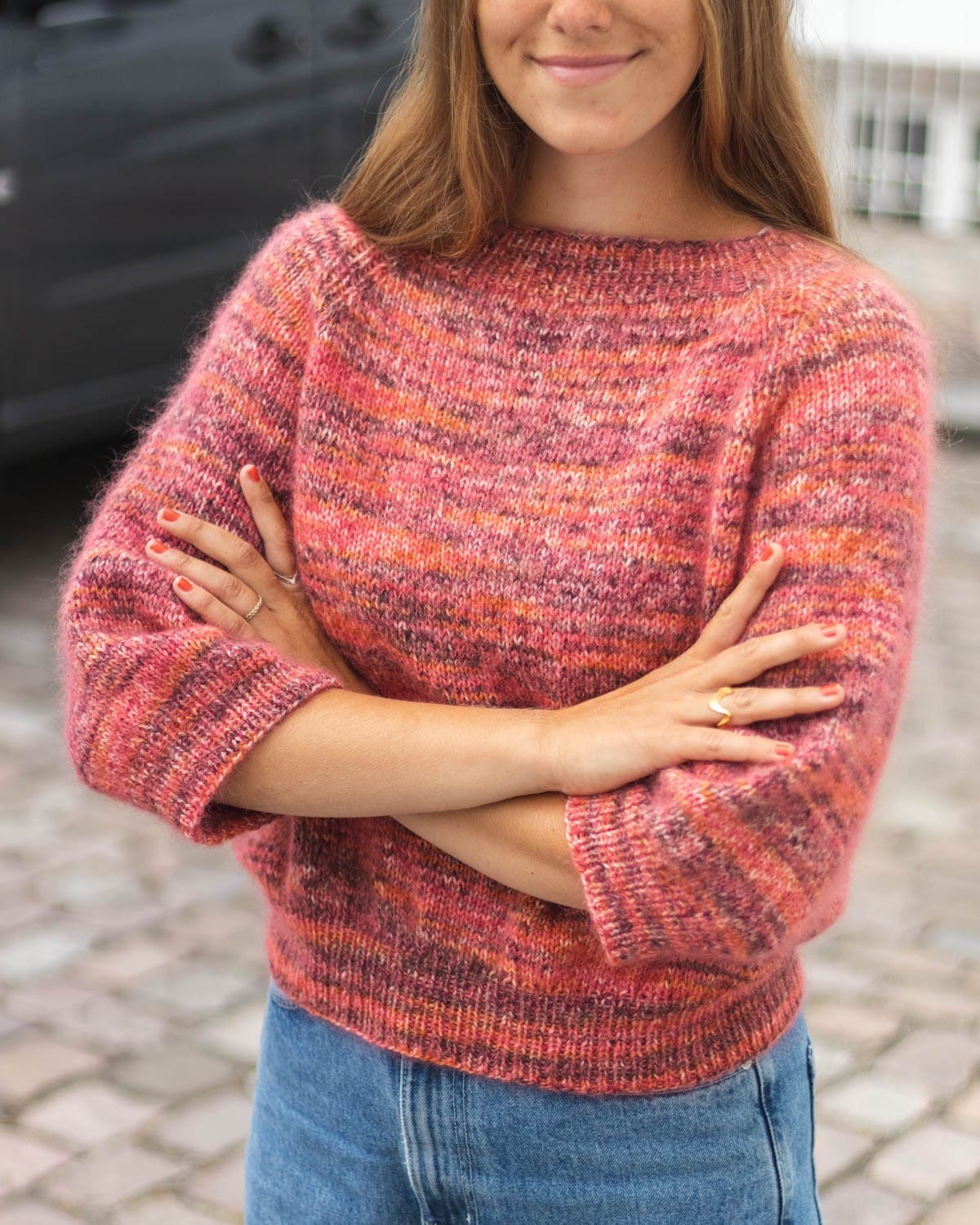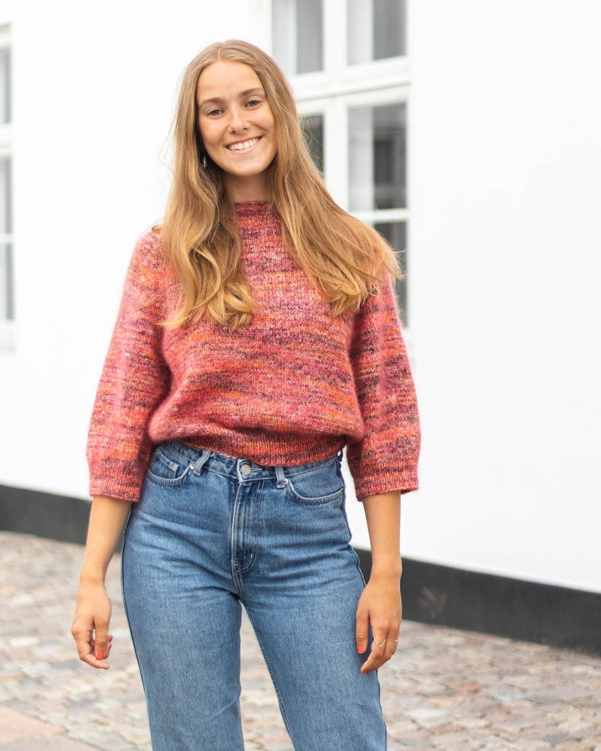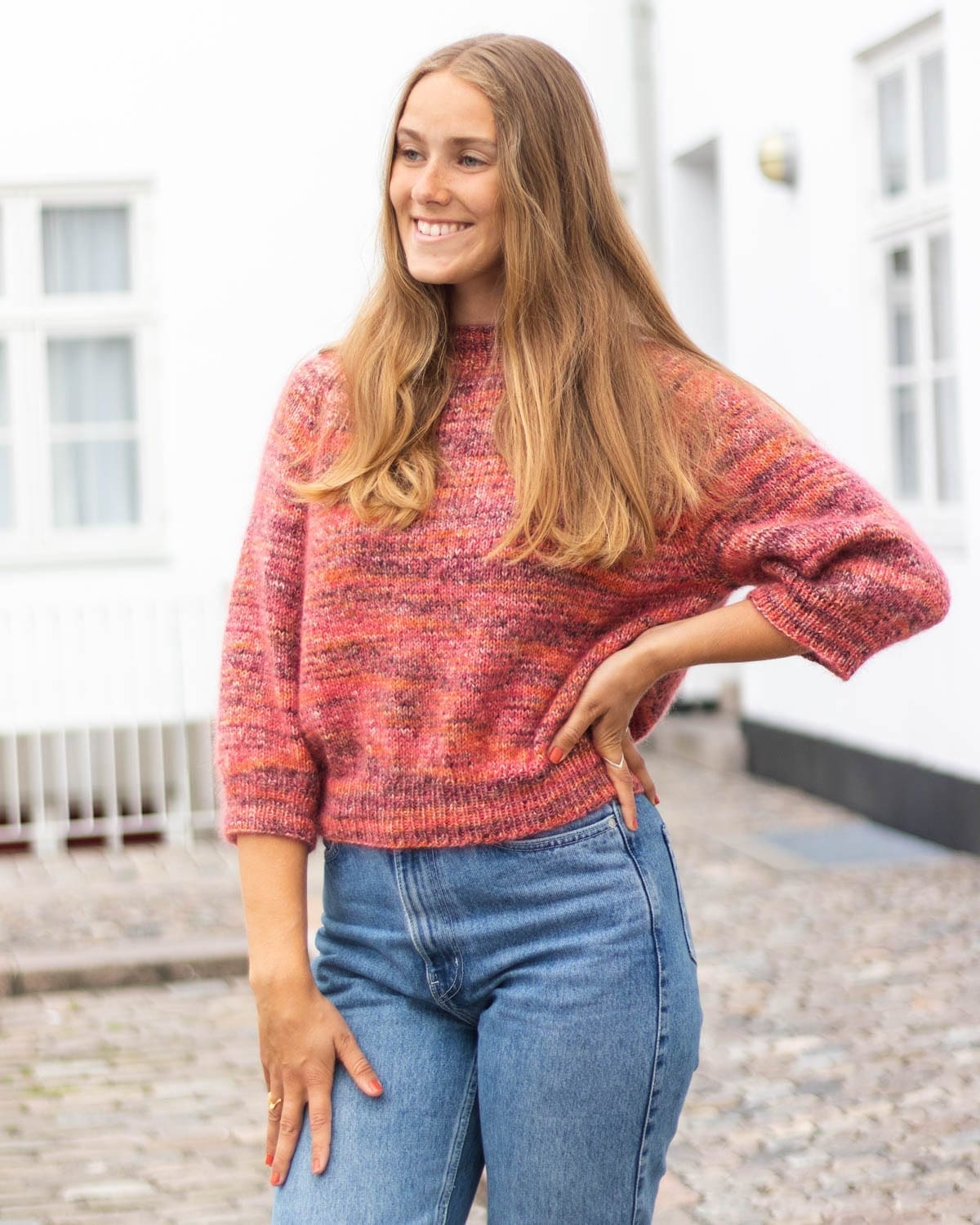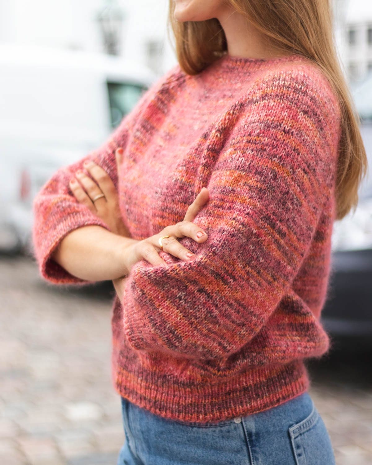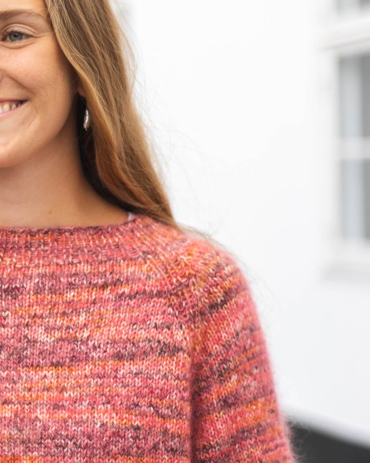 Sweateren strikkes oppe fra og ned og har en dyb fin raglan. Den strikkes på rundpind nr. 3,5 til kanterne og nr. 5 mm til resten af sweateren i en lækker kombination af uld og mohair.