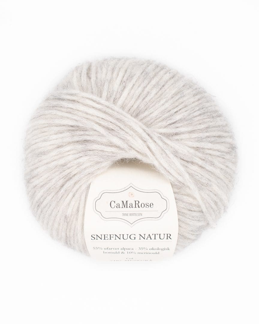 Snefnug Natur er sammensat af en økologisk bomuldstube, hvori en fin blanding af alpaca og merino er blæst ind i. Det gør Snefnug let, luftigt og meget blødt. Det gør også at Snefnug Natur ikke kan dele sig i flere tråde og det derved er nemt at strikke med.
