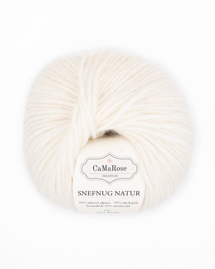 Snefnug Natur er sammensat af en økologisk bomuldstube, hvori en fin blanding af alpaca og merino er blæst ind i. Det gør Snefnug let, luftigt og meget blødt. Det gør også at Snefnug Natur ikke kan dele sig i flere tråde og det derved er nemt at strikke med.