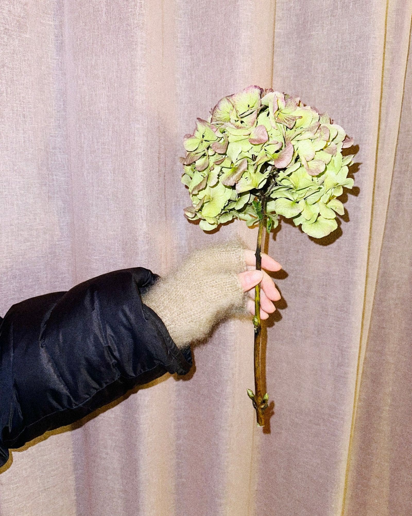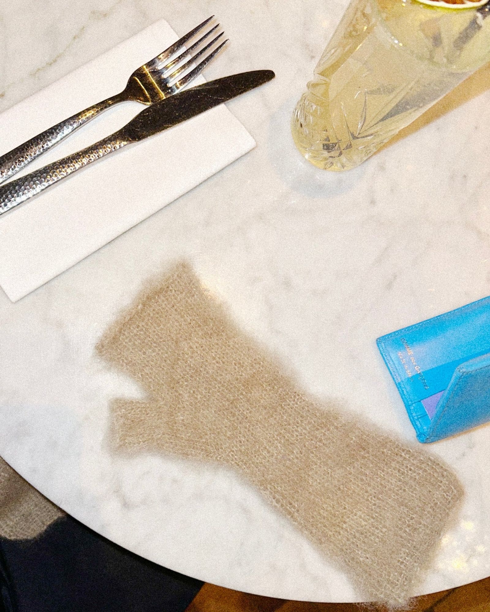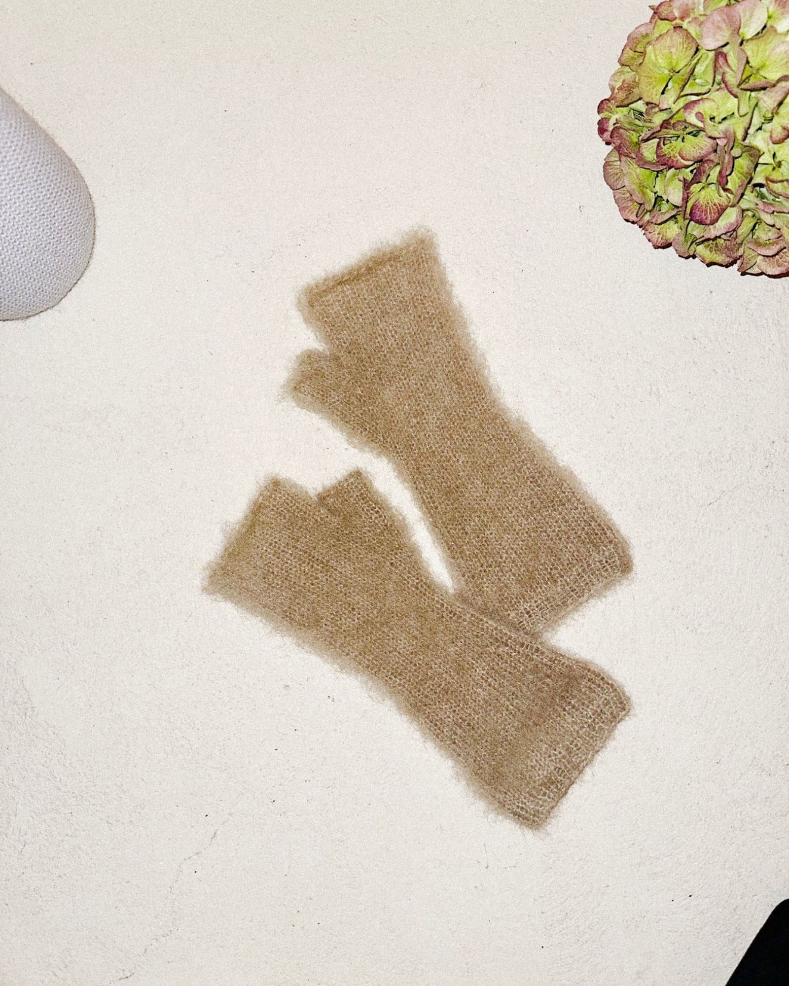 Håndledsvarmerne strikkes i mohair, som til sidst børstes op med en mohairbørste, så fibrene bliver lange og pels-agtige.