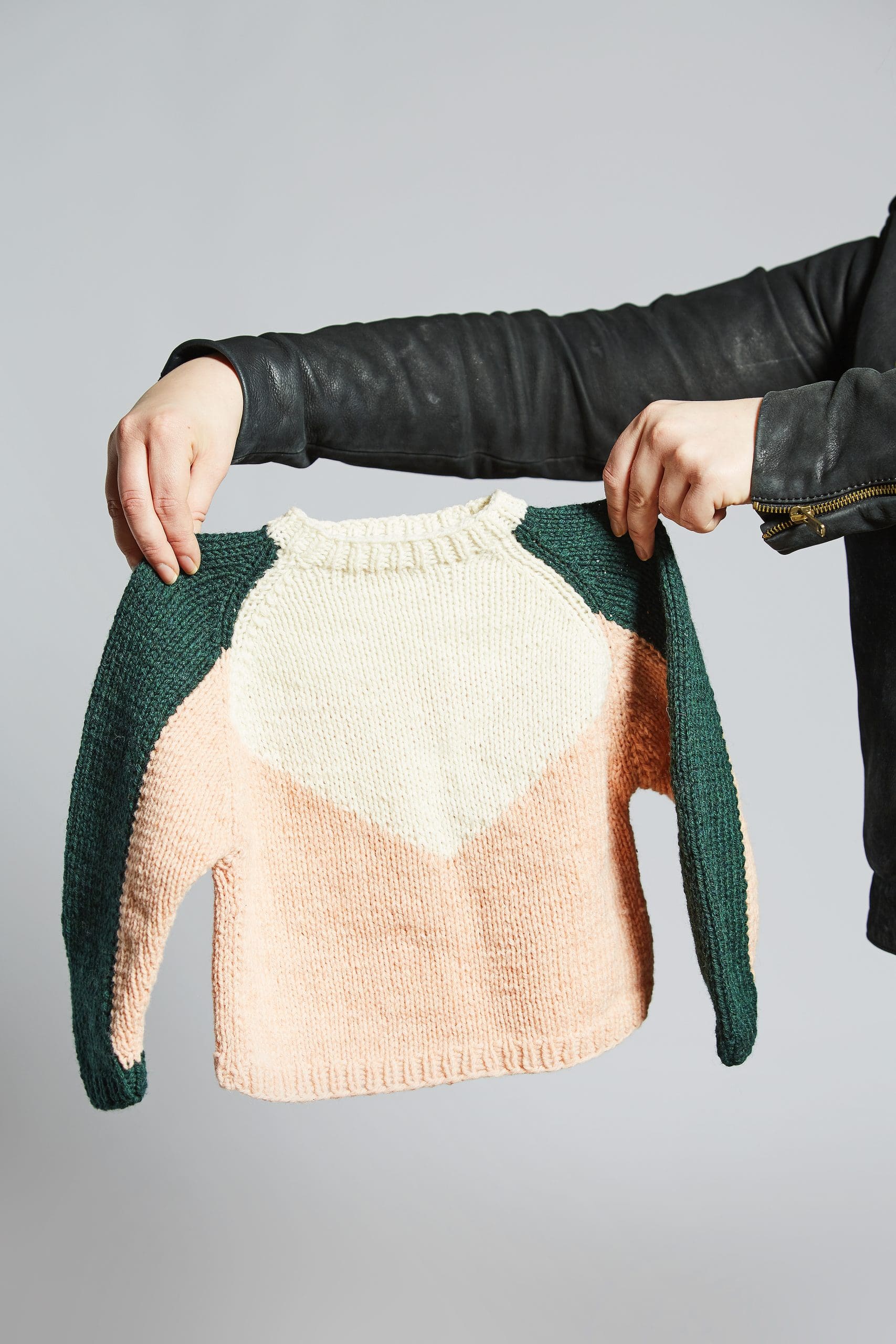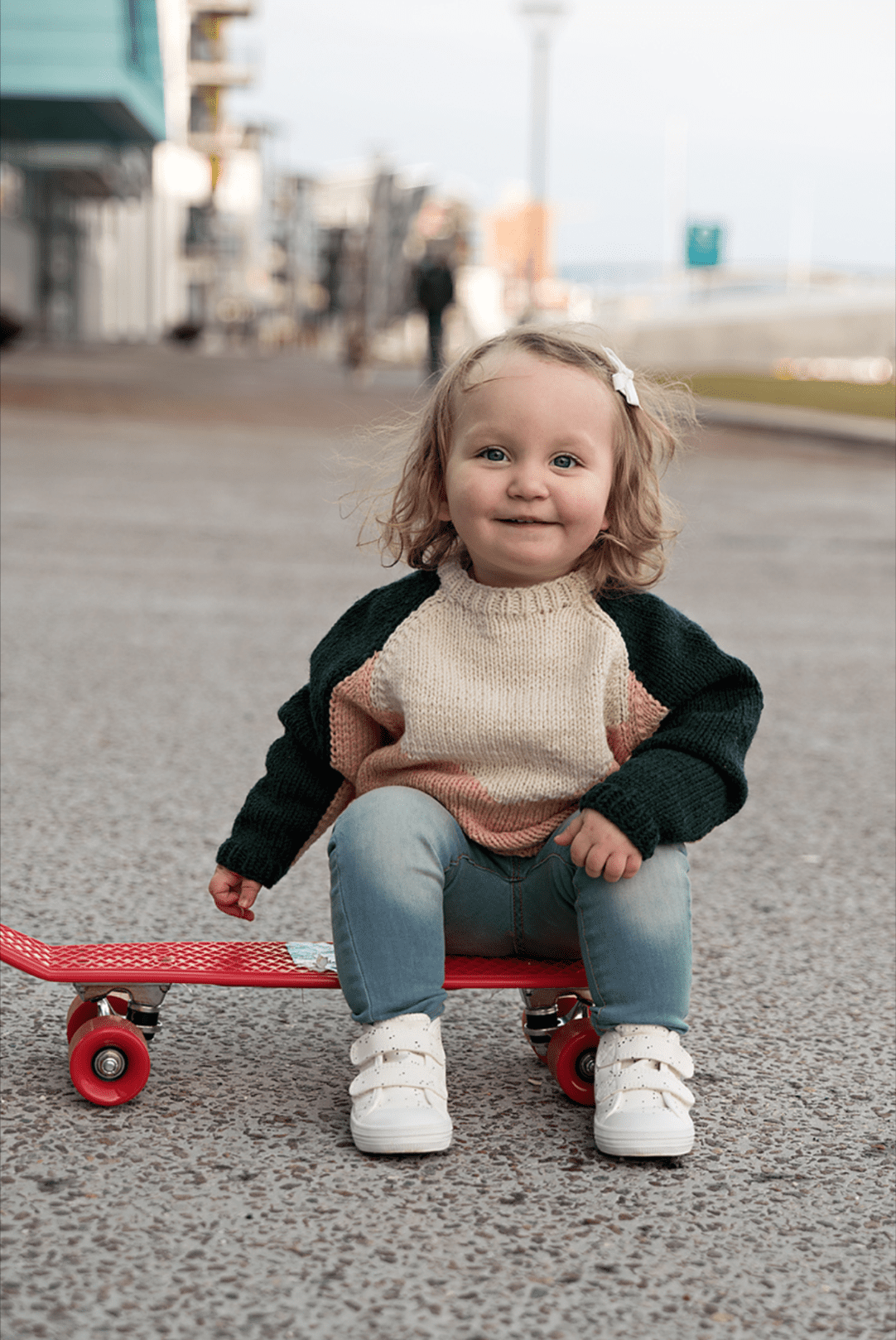 Fin børnesweater strikket i glatstrik med farveskift på krop og ærmer.