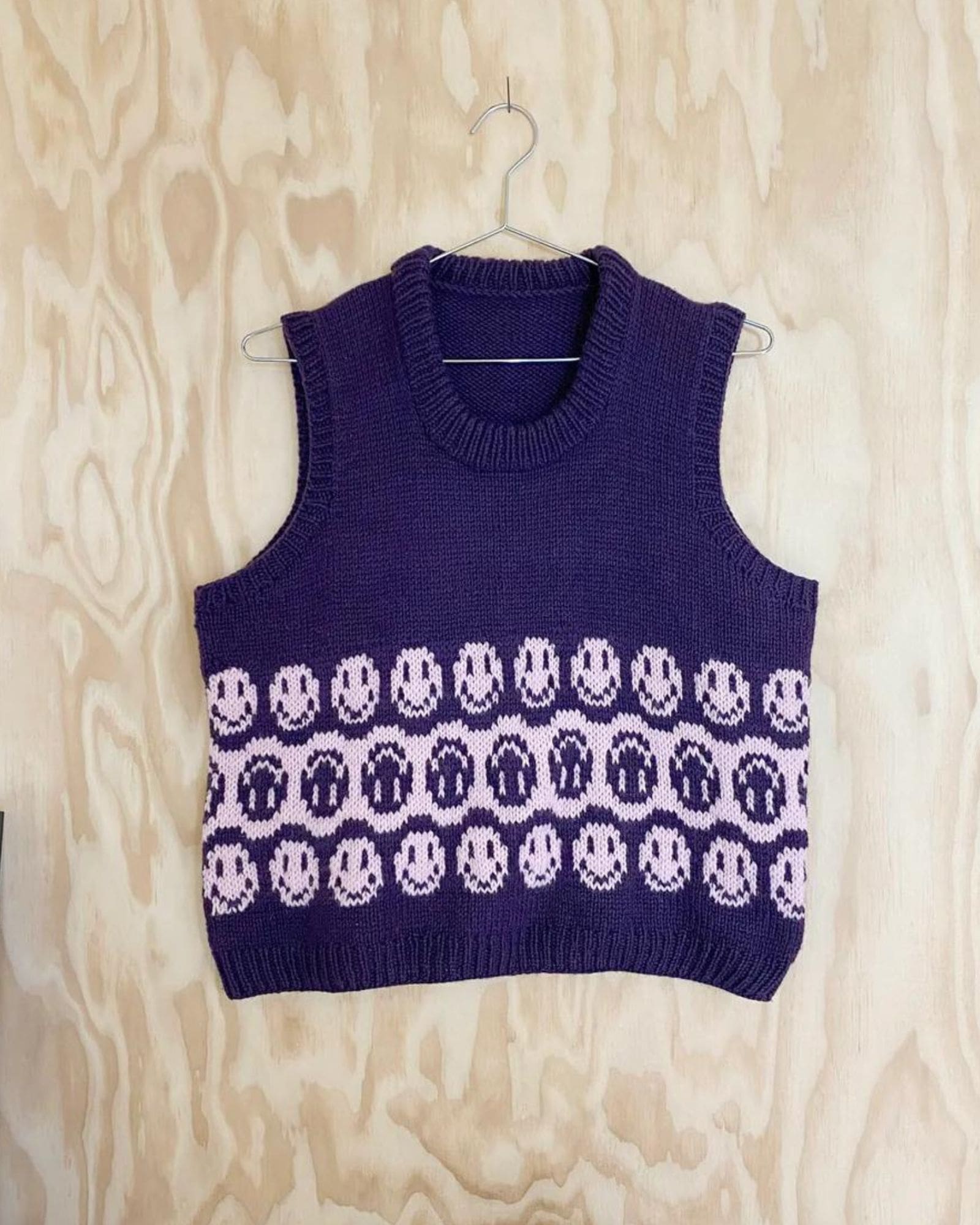 Vest med smileymønster. Strikkes oppefra og ned og er et godt projekt, hvis du er begynder i mønsterstrik.