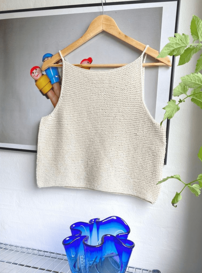 Nem og enkel retstrikket top, som strikkes i ét stykke. Stropperne strikkes via i-cord. Kan bruges som sommerstrik eller over en trøje til de koldere dage. Toppen vil give sig i længden i brug.