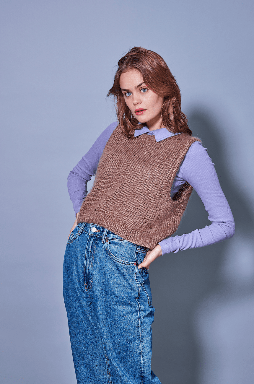Skøn og let vest, strikket i 3 tråde mohair. Hvis man ønsker et mere farverigt resultat kan man med fordel bruge 3 forskellige farver mohair.