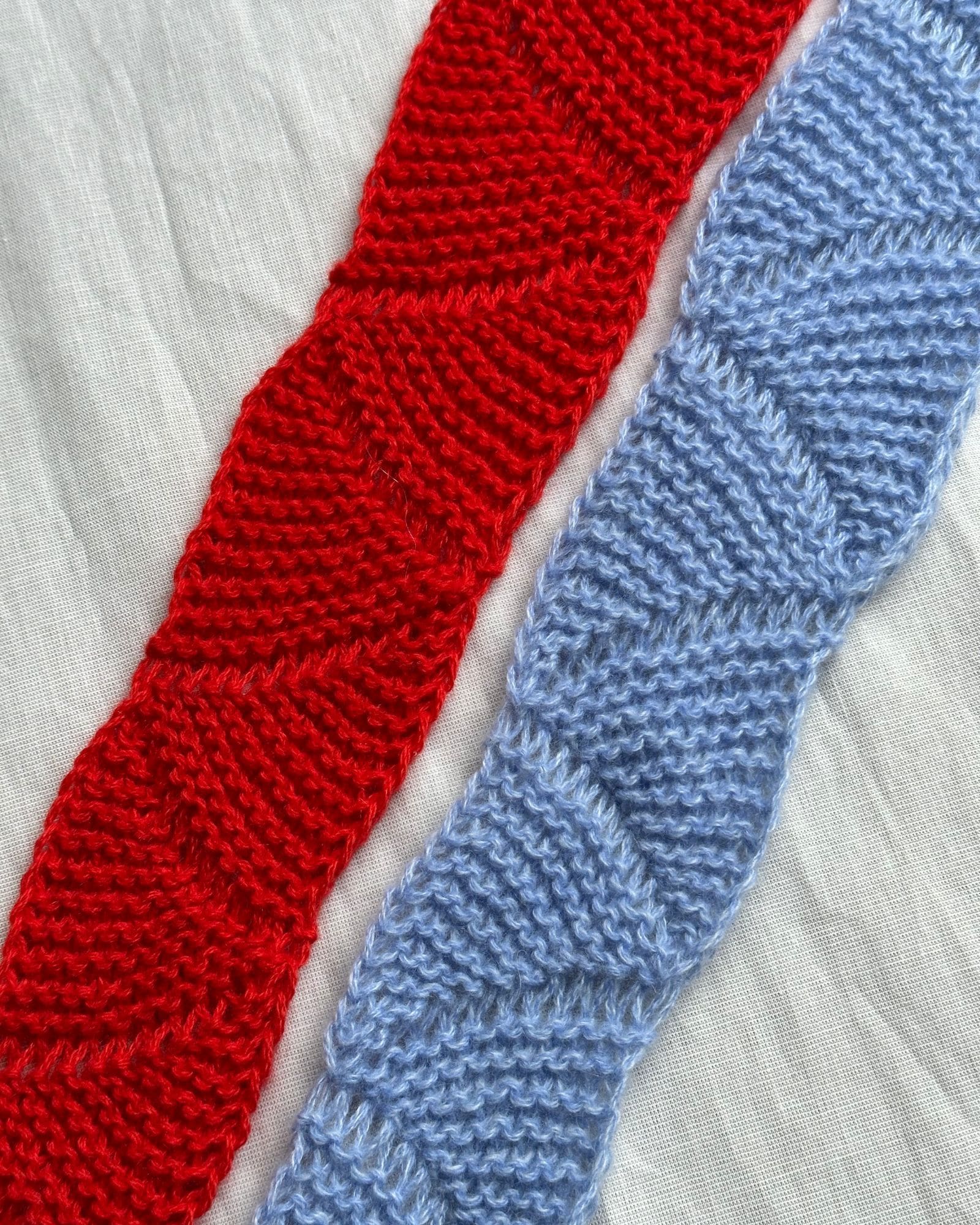 The blue Tokyo Scarf is knitted in Cardiff Cashmere col. 556 Artico. The red scarf is knitted in Cardiff Cashmere col. 517 Hermes.