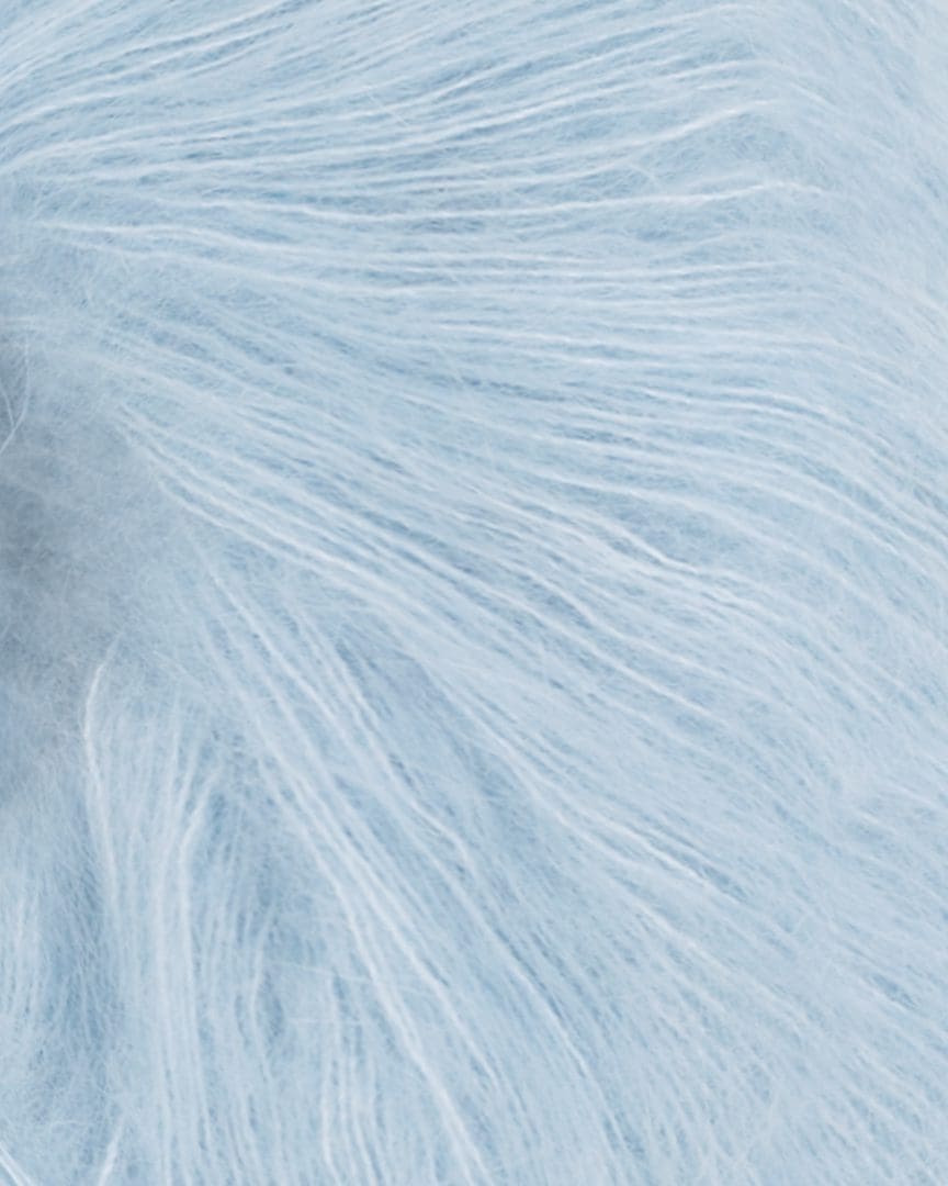 Vi strikker den rigtig meget sammen med andre garner, men man kan også strikke med den alene. Den får et fjerlet udtryk, man kan næsten fornemme den her grundtråd som er silken, hvor mohairen er spundet på. Det er virkelig en rigtig blød garn og den bliver også rigtig fin, når den bliver strikket.