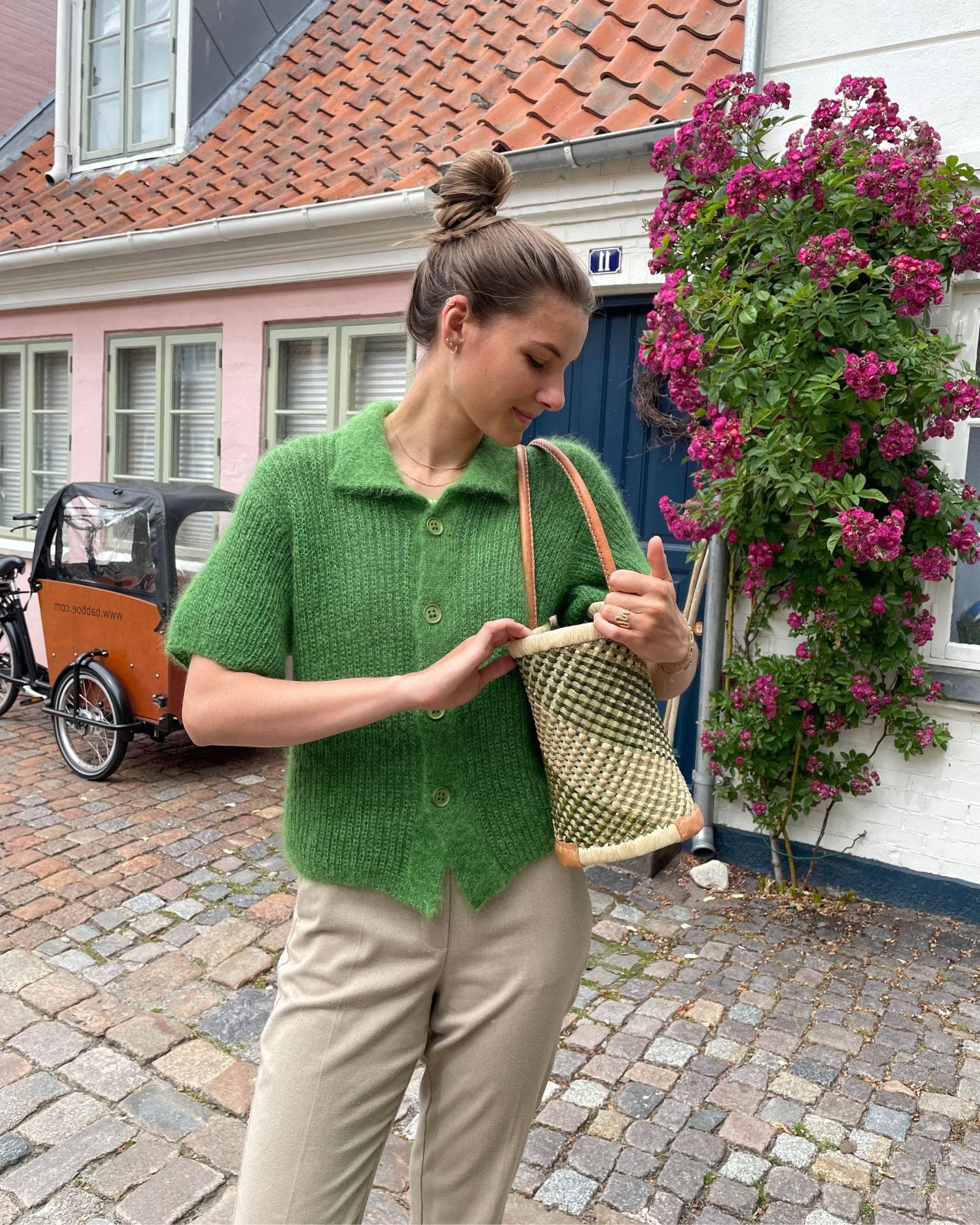 The green Valley Shirt is knitted in Alpaca 1 col. 56 and Tilia col. 279 Juciy Green