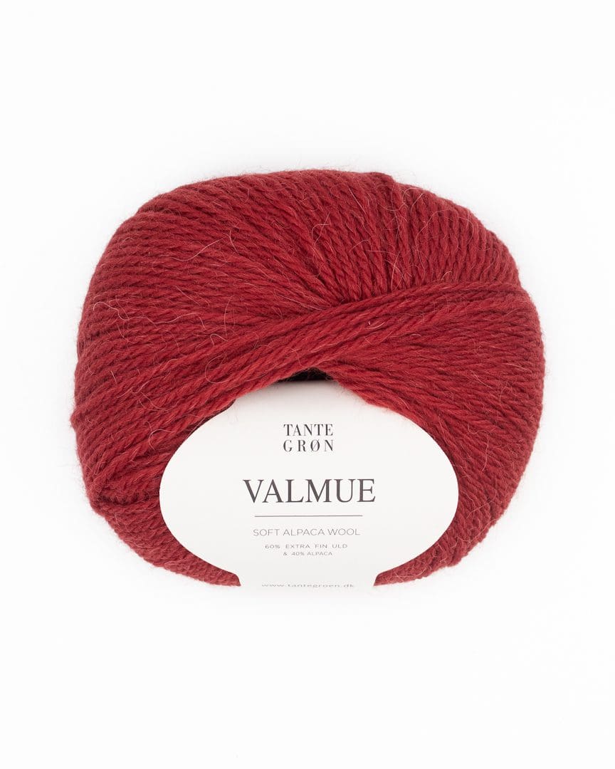 Valmue er en lækker og blød kombination af 40 % alpaka og 60 % ekstra fin uld. Den strikkes på pinde 3,5 til 4,5 alt afhængig om det skal være tæt strikket eller lidt løsere. Valmue er en alsidig garn og er smuk i glatstrik såvel som strukturstrik. Indholdet af alpakka giver også Valmue en let og lodden struktur i det færdige strik.