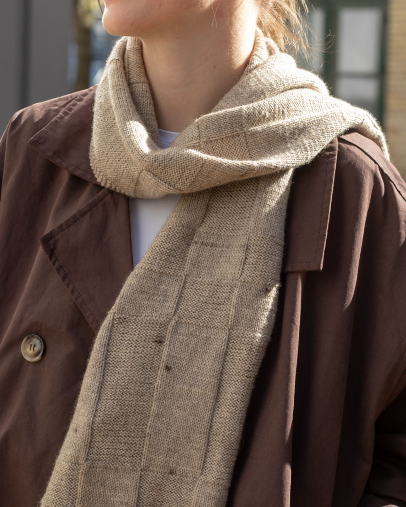Vibe Shawl er en del af den populære Vibe-serie, hvor kvadratiske og rektangulære segmenter danner et stilrent, grafisk mønster. Strukturen skabes med en kombination af ret- og vrangmasker, hvilket gør tørklædet smukt på begge sider.