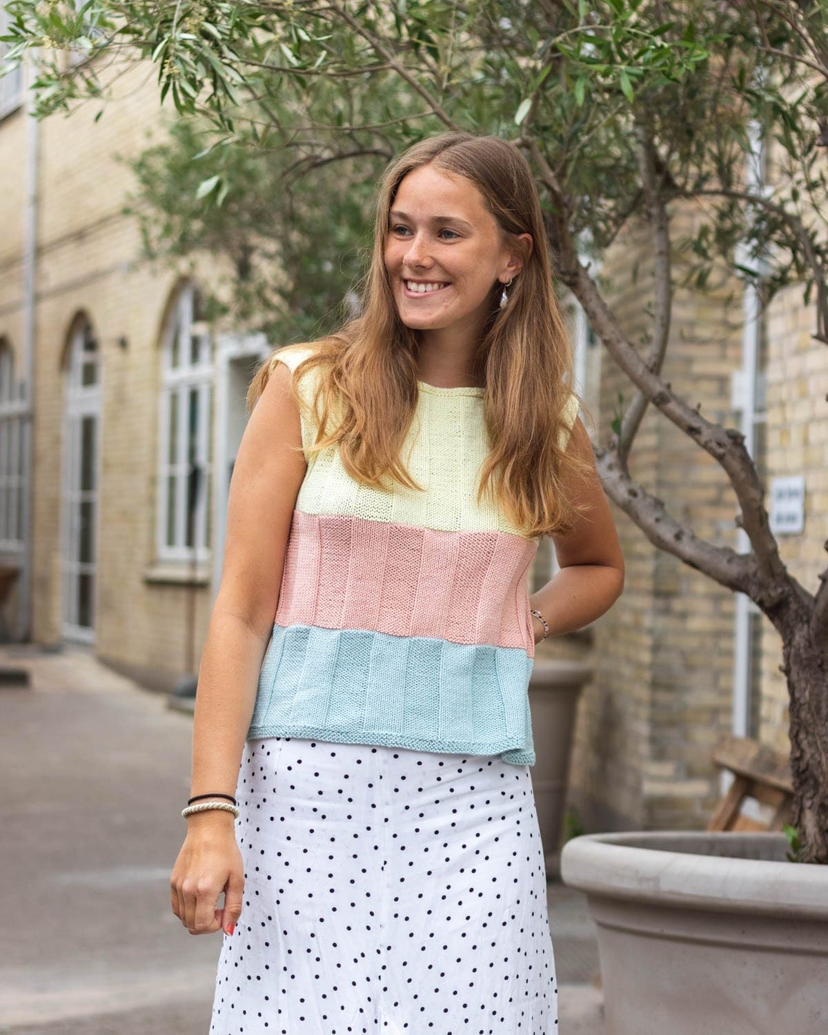 Toppen er strikket i det bløde bomuldsgarn Havblik, der er fantastisk i de varme måneder. Det gør også at toppen er fuldstændig kradsefri.