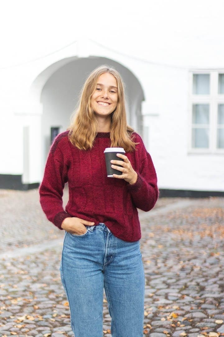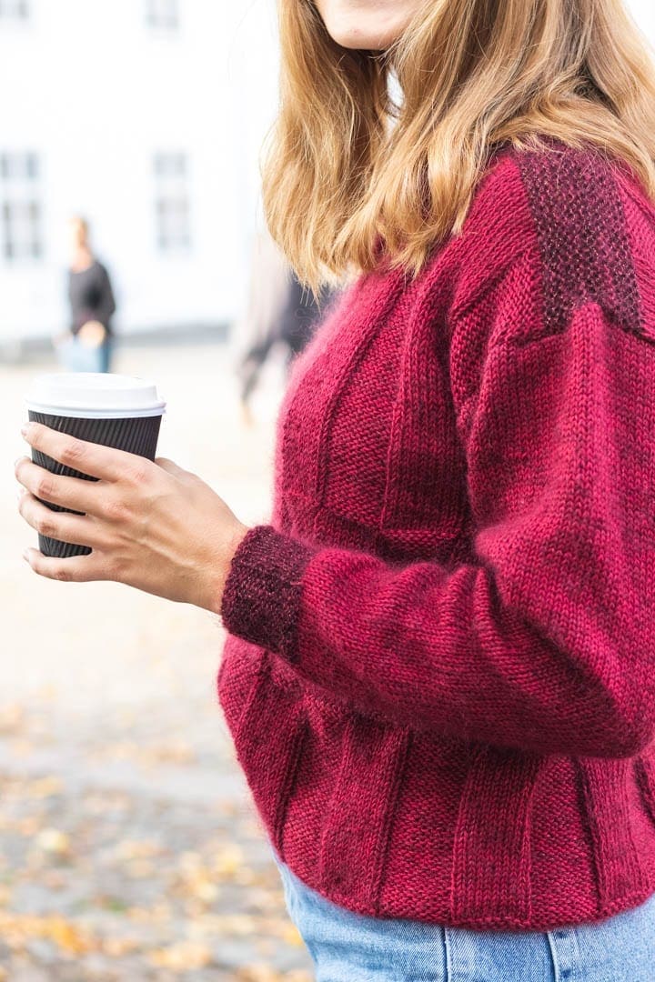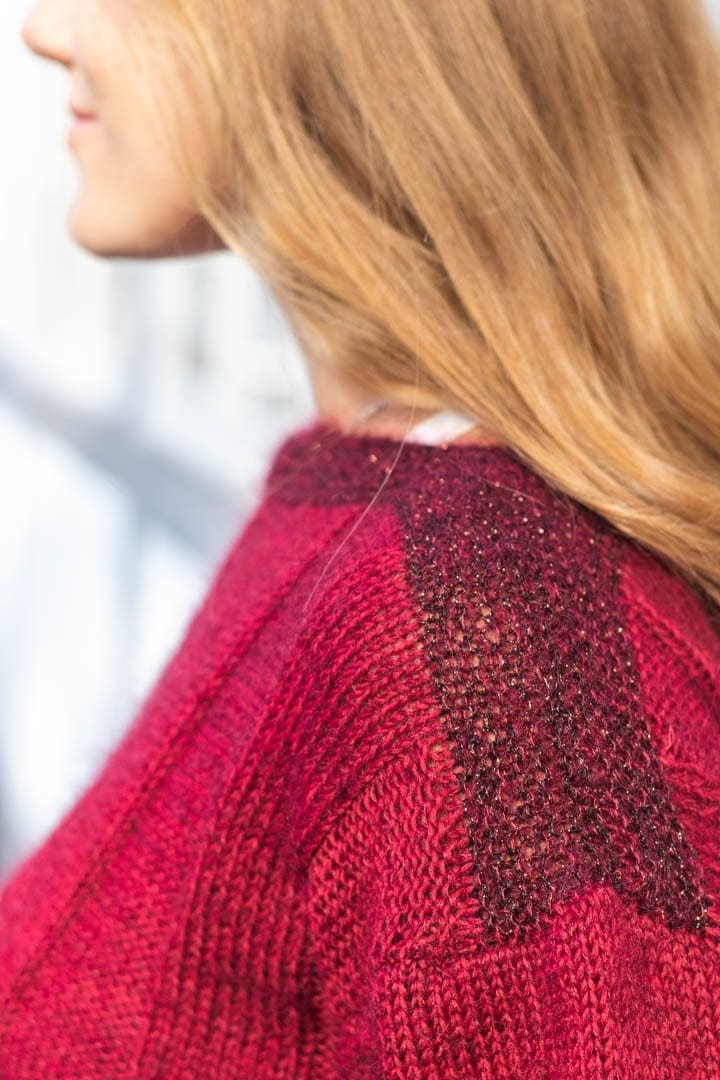 Vibe Vinterbluse er strikket i Silk Mohair farve 38 Vinrød (udgået) og Bio Blomsterfrø farve 120 Bordeaux (udgået). Den fine glimmerdetalje er Paia i farve 706.