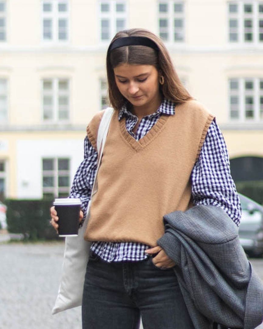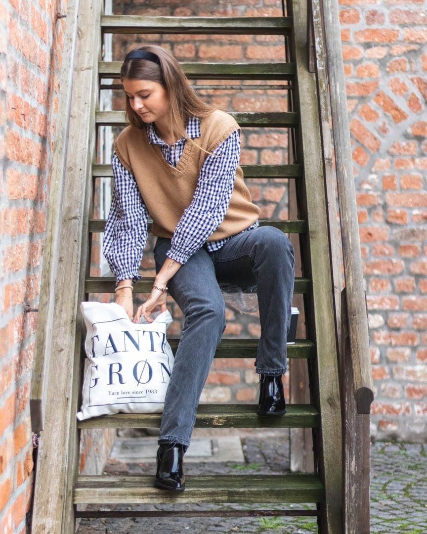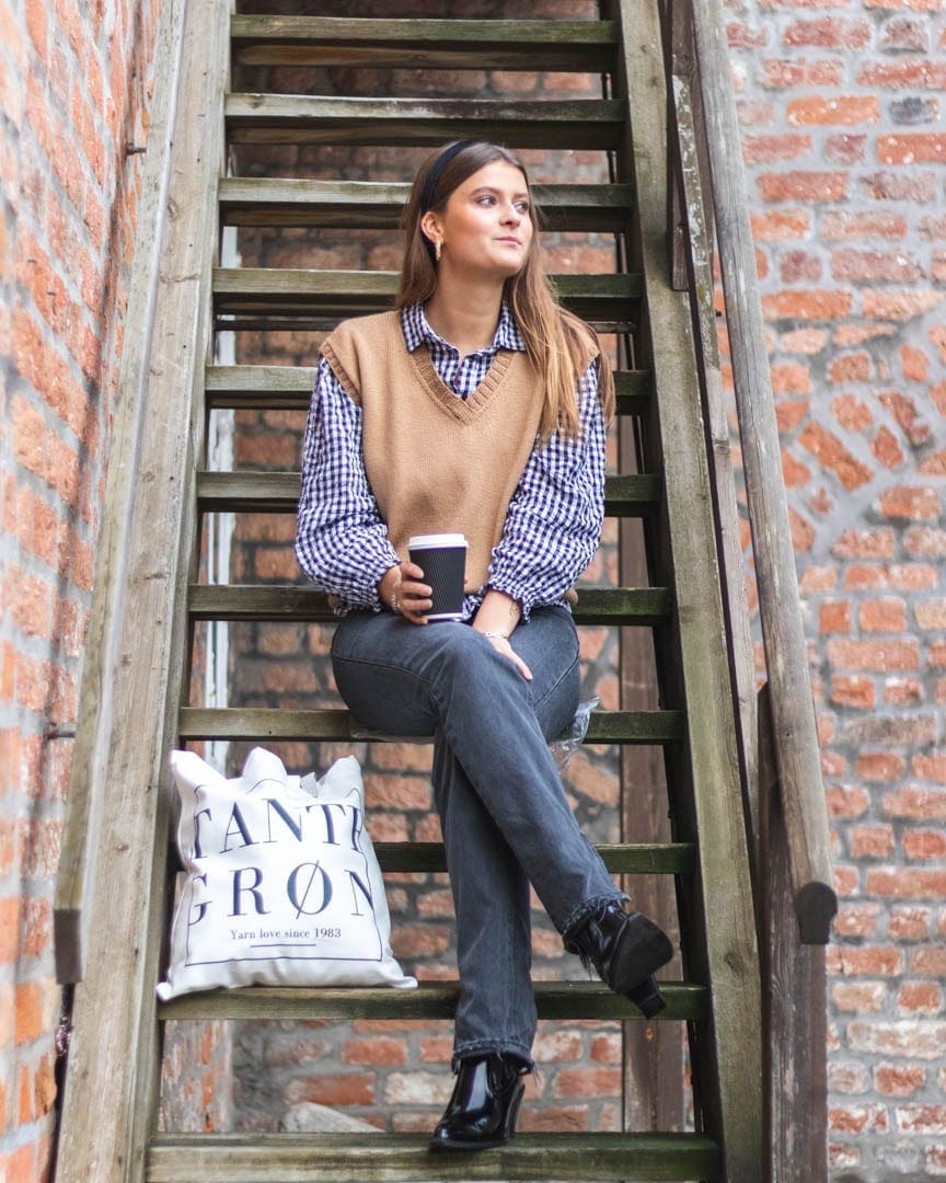 Weekday Vest er den perfekt vest over en fin skjorte eller kjole. Den er med en klassisk v-udskæring og et oversize look. Her er vesten stylet så fint udover en ternet skjorte og med et par rå støvler og jeans. Den oversize pasform sidder rigtig godt og med v-udskæringen er der fint plads til kraven på skjorten.